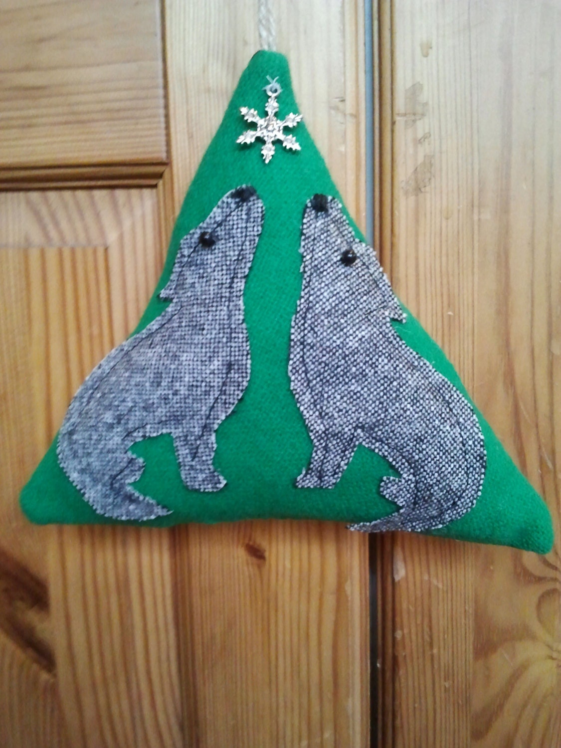 made easy by Etsy Store CraftyBunnyDoghanging, decoration, handmade, christmas, xmas, fabric, square, tree, christmas tree, dog lover, wolf, howling, snow