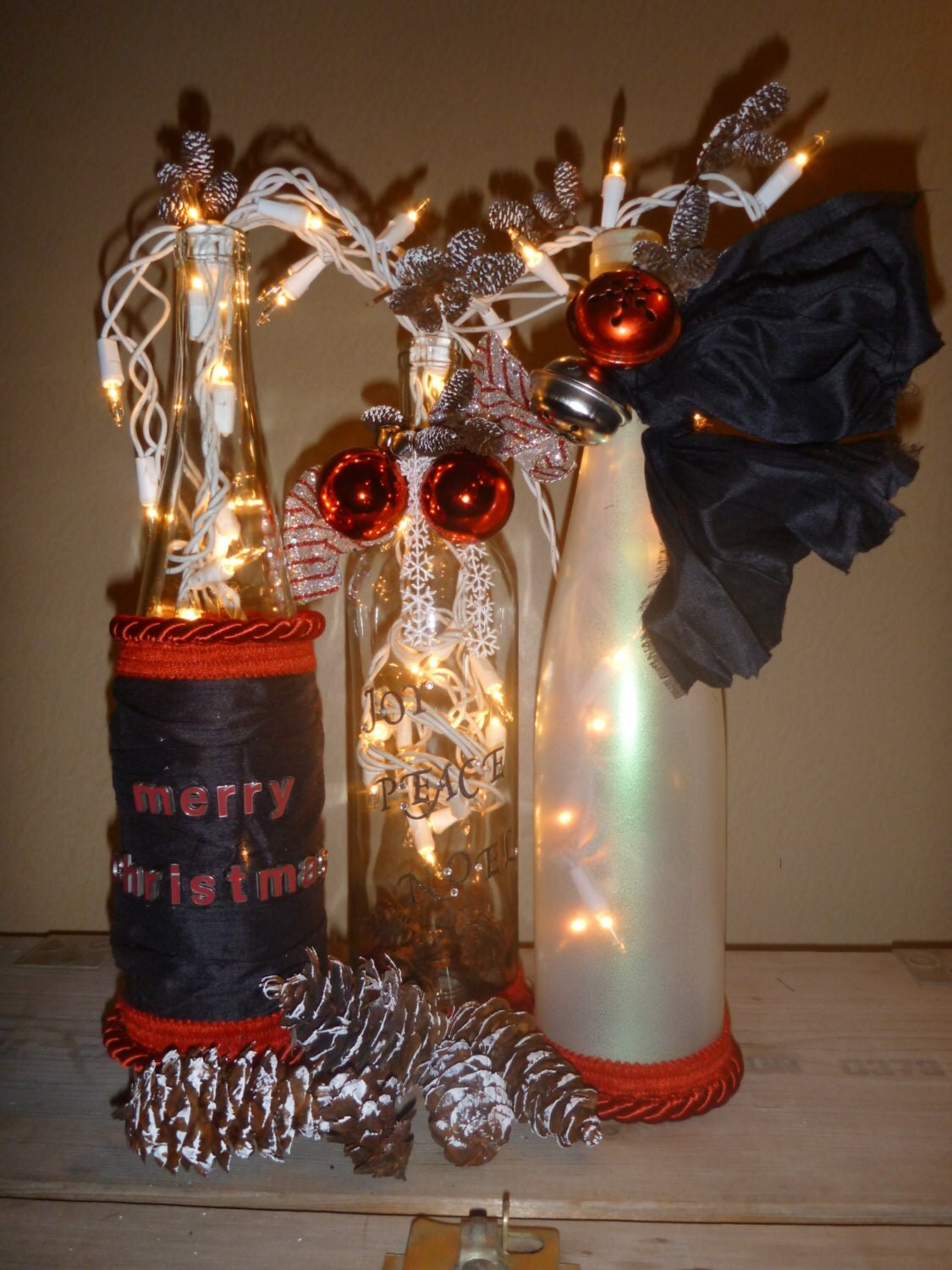 made easy by Etsy Store HellesReCreationsChristmas, Holidays, Wine, Bottle, Lights, Silver bells, Ornaments, Pinecones, Silver, Black, Red, Glittler, Handmade