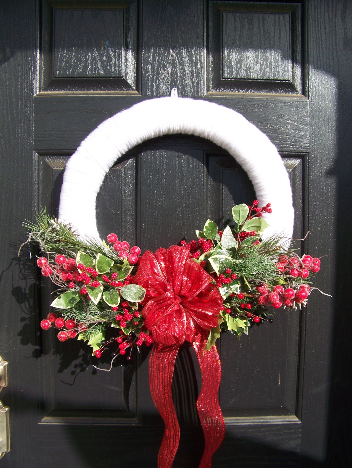 is for sale in Etsy Store Gamalisawoodsy, wall décor, decoration, décor, homemade, mantle wreath, yarn wreath, winter, bow, red, unique, one of a kind, berries